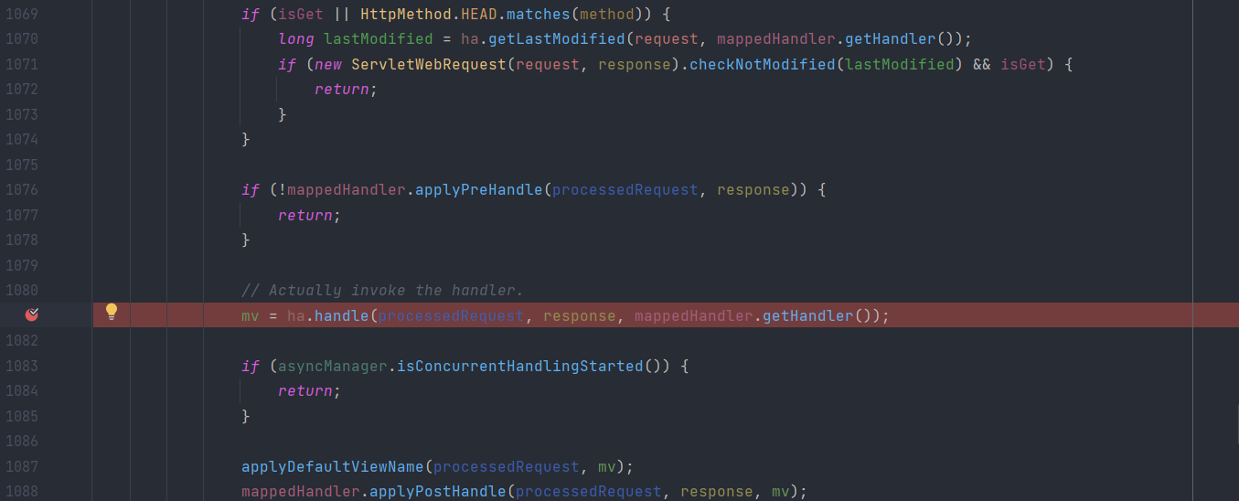먼저, DispatcherServlet의 doDispatch() 중간에 위치한 HandlerAdapter.handle()호출 부분에 breaking point를 건다.